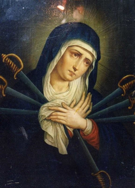 Artist Unknown: In devotional art, the Immaculate Heart of Mary is traditionally depicted pierced with seven wounds or swords, in homage to the seven sorrows of Mary. The Immaculate Heart of Mary refers to the interior life of the Blessed Virgin Mary — her joys and sorrows, her virtues and hidden perfections, and, above all, her virginal love for God the Father, her maternal love for her son Jesus, and her compassionate love for all people.