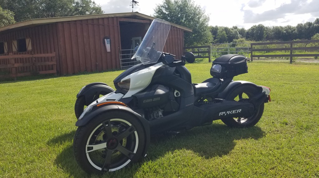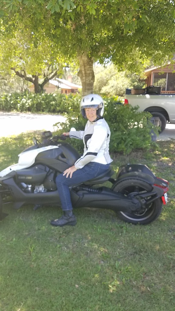 I was married right after I graduated from college at 20 many moons ago with my art and teaching degree, and my husband got me started right off with a Honda 200CL. I moved up quickly. to a 360, a 400, a 500 and had several 650’s and then a 900. I stopped riding 10 years ago, because so many riders were dying riding on our increasingly busy roads, with many more distracted drivers. But then, a year and a half ago my husband pulled in the driveway on a Ryker 900 he had just bought! (yes…there were still two other bikes of his in the garage, including a Ninja 1000!) I took one look and said…” Get OFF! I gotta ride this!” The very next day we were at the dealership and I purchased my own Ryker 900 from Ray the manager and a super great guy. Hubby and I both got excellent deals because both were “as new demo bikes”. Mine had less than 75 miles on it! My husband rode mine home through highly congested city traffic out to our home in the country…and I’ve ridden it ever since!